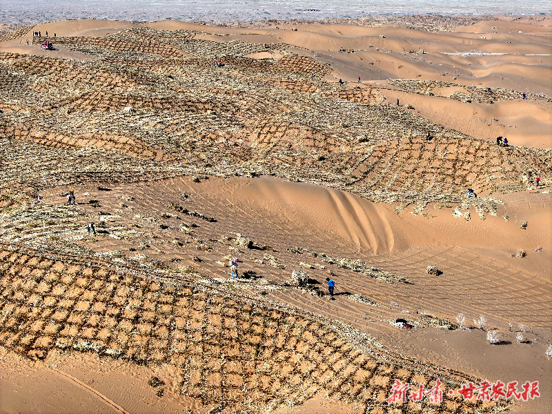 民勤縣栽樁石春季治沙現(xiàn)場(chǎng)。