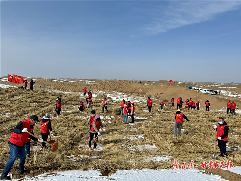 初春天氣,乍暖還寒。上午10時許,連綿起伏的沙丘上,黨旗飄飄,人頭攢動。大家拿著工具,分工明確,三人一隊、五人一組,扶犁開溝、俯身鋪草、揮鍬壓埋、填沙整型……現(xiàn)場一派熱火朝天的景象。
