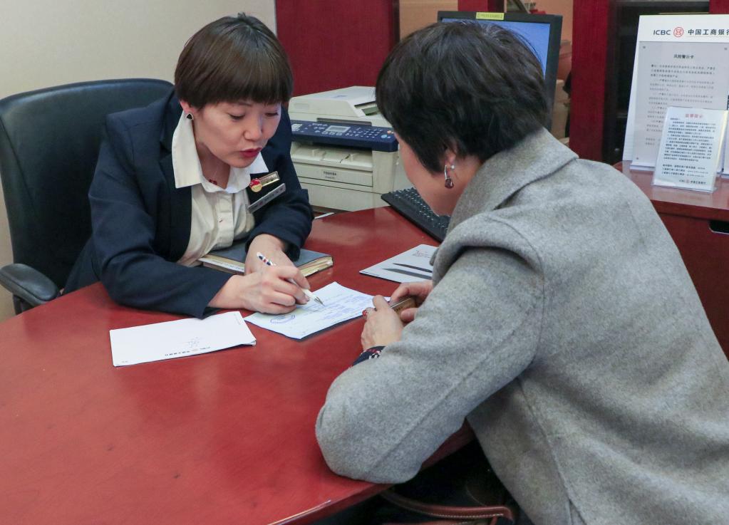 在中國工商銀行新疆烏魯木齊的一處營業(yè)網(wǎng)點,李鵬(左)為客戶解答問題(2018年11月攝)。新華社發(fā)