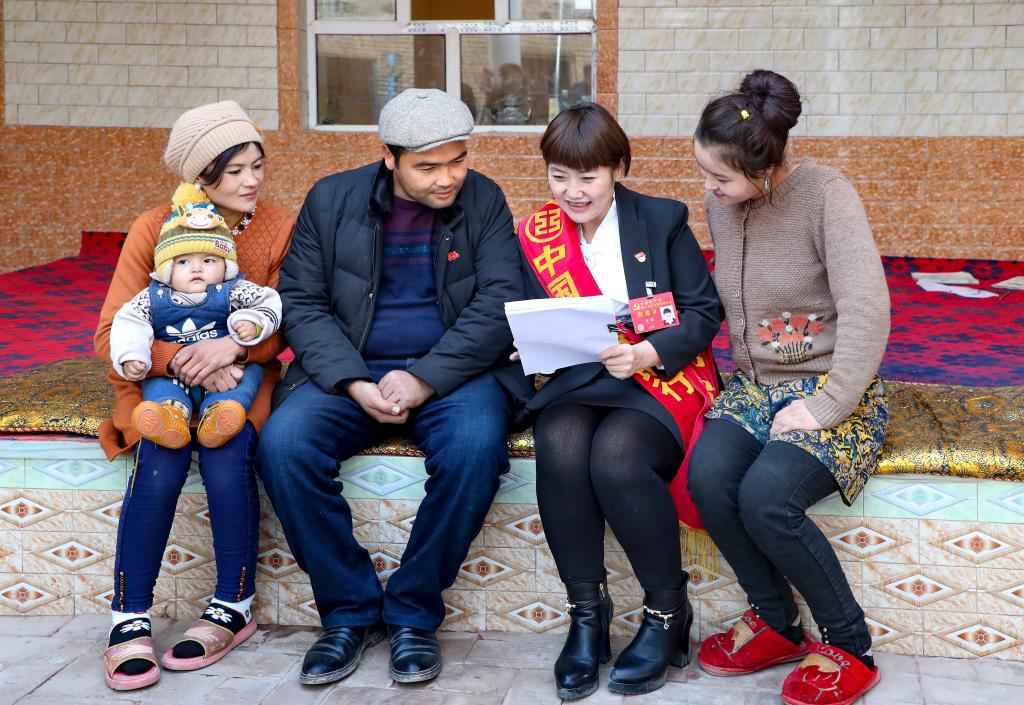 李鵬在新疆喀什地區(qū)疏勒縣塔尕爾其鄉(xiāng)塔尕爾其村向村民進行理論宣傳(2017年12月攝)。新華社發(fā)